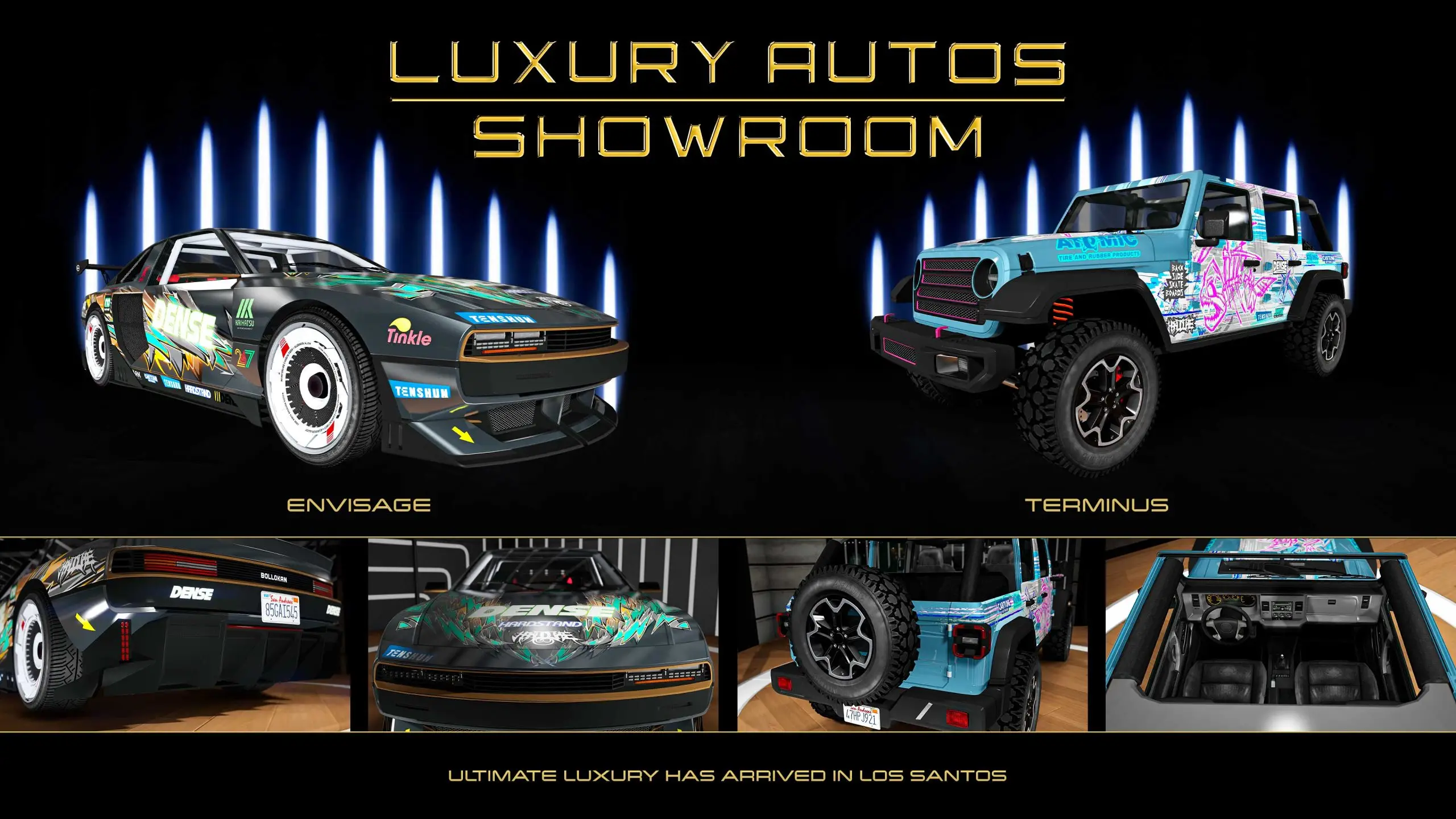 Cruise through Rockford Hills and pull up to the Luxury Autos showroom for a closer look at the Bollokan Envisage (Sports) and Canis Terminus (Off-Road) shining behind the window display.